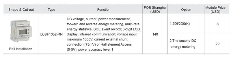 DJSF1352-RN series intelligent DC energy meter is designed for applications such as DC panels, solar power,telecommunications base stations, and charging posts. This series of instruments can measure voltage, current, power,forward and reverse power in DC system. It can be used for local display, and connected with industrial control