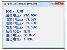雙擊集中電源設(shè)備,則會出現(xiàn)集中電源的狀態(tài)一欄,該欄中顯示此集中電源的工作狀態(tài),主、備電源電壓值。要查看具體信息時,請雙擊狀態(tài)信息欄,可查看詳細(xì)工作信息,包括當(dāng)前輸出電壓值和輸出電流值。