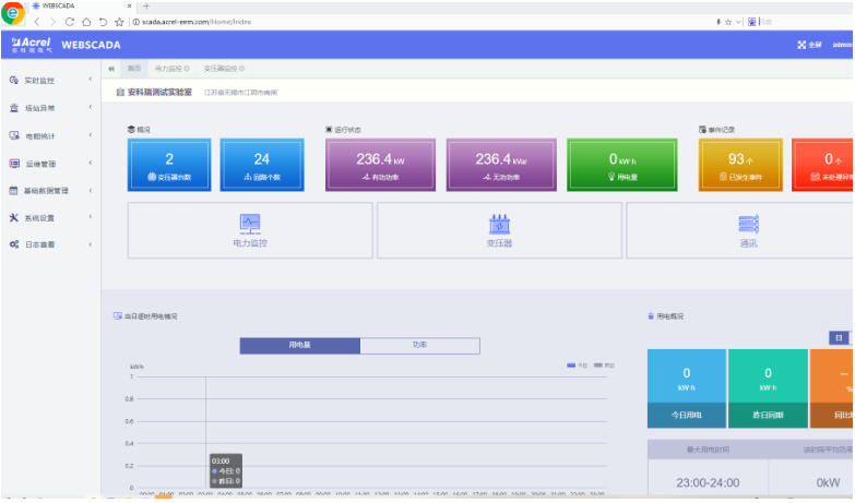展示頁面顯示變電站數(shù)量、變壓器數(shù)量、監(jiān)測點位數(shù)量等概況信息,設(shè)備通信狀態(tài),用電分析和事件記錄。首頁顯示場站的變壓器數(shù)量、回路個數(shù)、有功功率、無功功率、用電量、事件記錄等概況信息,可通過實時監(jiān)控、變壓器、通信、視頻切換到需要查看的界面。